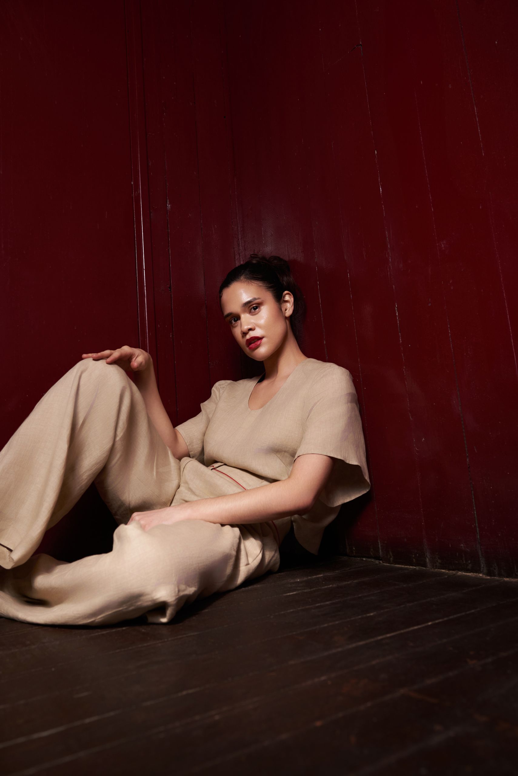 L'ensemble Dina allie élégance et confort avec un haut fluide au col travaillé et un pantalon large taille haute, idéal pour une silhouette allongée et une allure sophistiquée en toute occasion.